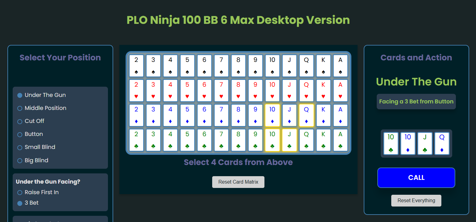 PLO Ninja is a real-time preflop decision tool for Pot Limit Omaha (PLO) poker. It instantly advises whether to Raise, Call, Fold, 3-bet, or 4-bet any 4-card hand from any position (UTG, MP, CO, BTN, SB) in a 100bb 6-max game. Using solver-computed GTO data tailored for online rake structures, you select your position, input your four cards, and get a precise decision. Its mobile-friendly interface simplifies PLO preflop strategy, including 3-bet and 4-bet ranges, aiding study or gameplay (check poker site rules)